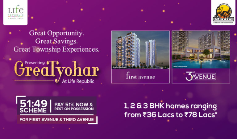 Kolte-Patil Developers has announced ‘GreaTyohar’ offer on 1, 2 and 3 BHK flats in Hinjewadi at Life Republic Township for their projects- First Avenue and Third Avenue. The scheme is introduced to provide financial relief to homebuyers and make owning a home more attractive for first-time buyers or those investing in Pune. With GreaTyohar, buyers can avail the 51:49 scheme, where they get to pay only 51% of the total amount and rest on the possession of their dream home at the Kolte-Patil Life Republic. The 51:49 scheme is applicable only for 1, 2 and 3 BHK flats in Hinjewadi at First Avenue and Third Avenue of Life Republic Townships. These 1, 2 and 3 BHK flats in Hinjewadi ranges from 36 lacs to 78 lacs*.